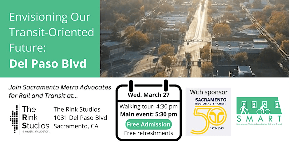 Sacramento Metro Advocates for Rail and Transit (SMART), SacRT, and other partners are sponsoring an event on March 27, entitled Envisioning Our Transit-Oriented Future: Del Paso Boulevard. Registration is free and available on Eventbrite (though not required) at https://www.eventbrite.com/e/envisioning-our-transit-oriented-future-del-paso-boulevard-tickets-846392110587.