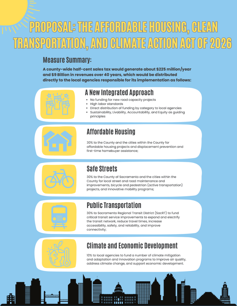 SacMoves Coalition supports the investment strategies represented by the Affordable Housing, Clean Transportation, and Climate Action Act of 2026 one-page summary, as developed by SMART (and many partners).